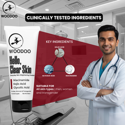 Woodoo’s Hello, Clear Skin Facewash is a Multifunctional Facewash formulated to target Acne, Acne marks, Hyperpigmentation, Milia, Open pores, Blackheads, Whiteheads, and Dull skin.